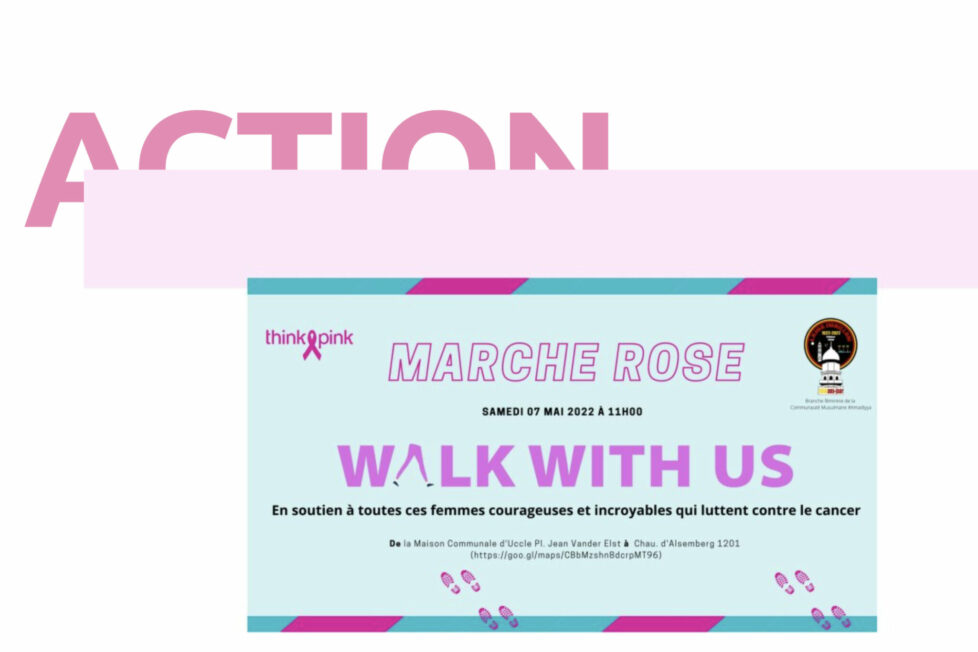 Le samedi 7 mai, les femmes et les hommes de la communauté musulmane Ahmadiyya d’Uccle, en collaboration avec l’association Think Pink, organisent une Marche Rose à travers la commune pour collecter des fonds au bénéfice de l’association de soutien aux femmes souffrant du cancer du sein. L’incidence de ce cancer en Belgique est la plus élevée de toute l’Union européenne. Participation : 5 euros, à payer sur place