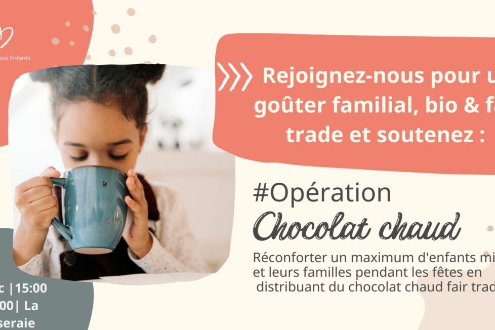 L’association uccloise Aimons Nos Enfants organise un goûter familial, musical, fair trade et bio, le 3 décembre, de 15 à 18h à La Roseraie (1299 chaussée d’Alsemberg) pour « réconforter des enfants migrants et leurs familles vivant dans des situations de précarité ». Possibilité aussi, outre les donations, et dans le même objectif, d’acheter un mug #Opération Chocolat Chaud (9 euros).