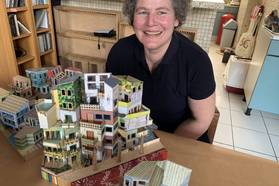 Natacha Louis: une carrière plus atypique que ça, tu meurs. D’abord formée comme architecte d’intérieur, à Saint-Luc, elle y a pris le goût de l’histoire de l’habitat et des maquettes ultra-précises en fin carton blanc. Puis s’est jetée à l’eau, pour devenir… monitrice de plongée. A rangé ses palmes au vestiaire et fait des études de criminologie et de sciences humaines. A travaillé comme DRH dans une grande entreprise, un job qui lui a valu un burn-out. Elle, qui a toujours été rêveuse et plutôt utopiste, n’y a pas seulement perdu une santé (retrouvée aujourd’hui), mais aussi et surtout l’envie de continuer à travailler dans l’ambiance stressante des conflits de pouvoir. “Depuis plusieurs années, je réalisais, pour leur beauté et mon plaisir, des maquettes de micro-immeubles et quartiers rêvés, parfaitement imaginaires. J’avais un job alimentaire, qui me permettait d’y consacrer un peu de temps. Je l’ai perdu. Alors, à l’approche de la cinquantaine, je me suis dit que c’était le moment ou jamais de franchir le pas et de faire de ce hobby artistique mon métier de cœur: être artiste.”